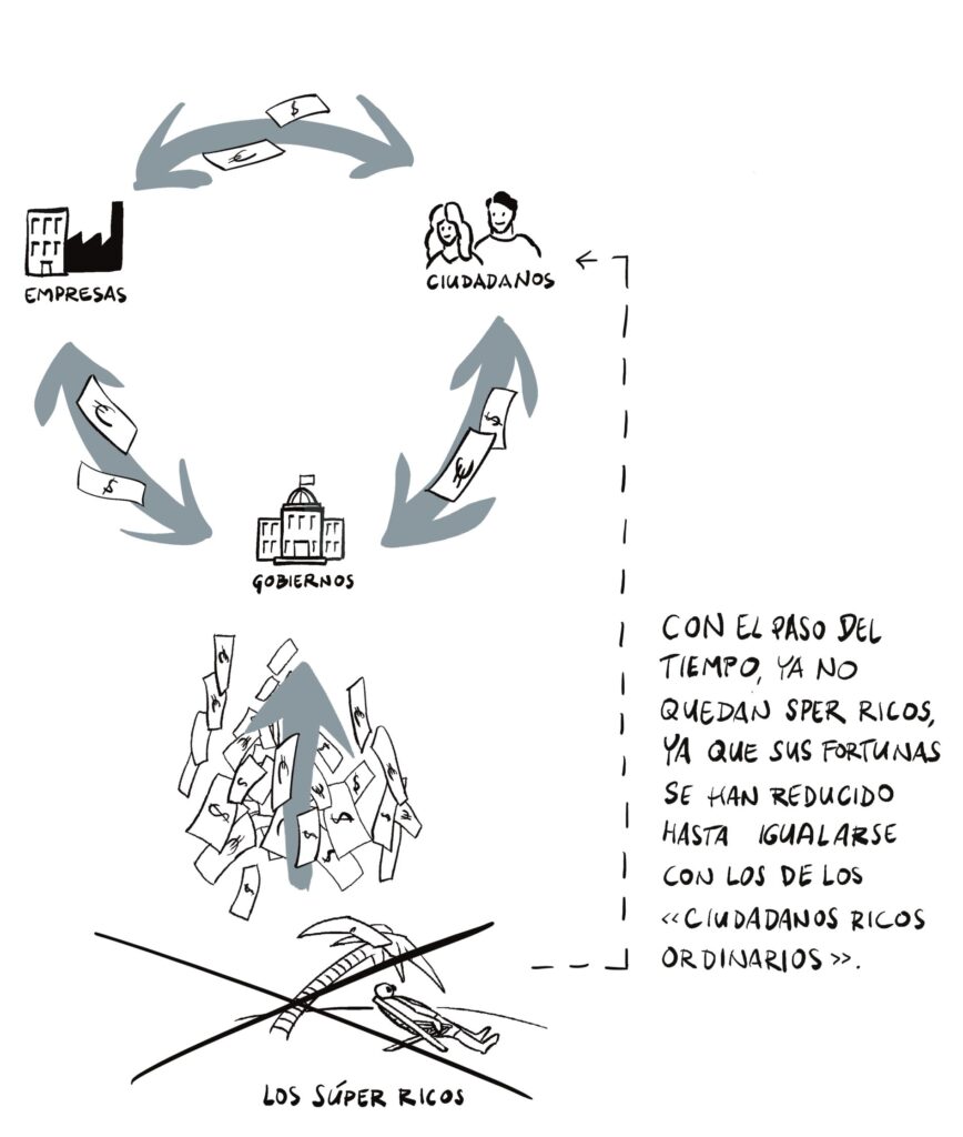 Figura – Situación final de Economía de «Impuesto a los superricos»: Una economía sana en la que todo el dinero fluye de vuelta a los ciudadanos.